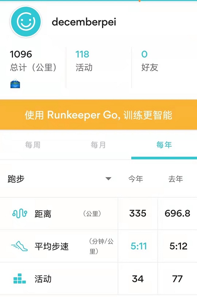 2021年是一个新的开始,作者用一个叫RunKeeper的App记录了一整年的跑步历程,并且根据这份记录算出了自己一整年的运动量。去年一共跑了77次步,共计696.8公里,全年平均配速5:12。这意味着作者同时做了大约77x108次引体向上,77x240次的俯卧撑,77x120次悬垂举腿,全年出勤308天。其实是有一些意外的,除了长假期间会借出游/回老家这样冠冕堂皇的理由“逃课”之外,自己居然还找各种理由偷懒了那么多次,差点吹破出勤300天的牛皮。